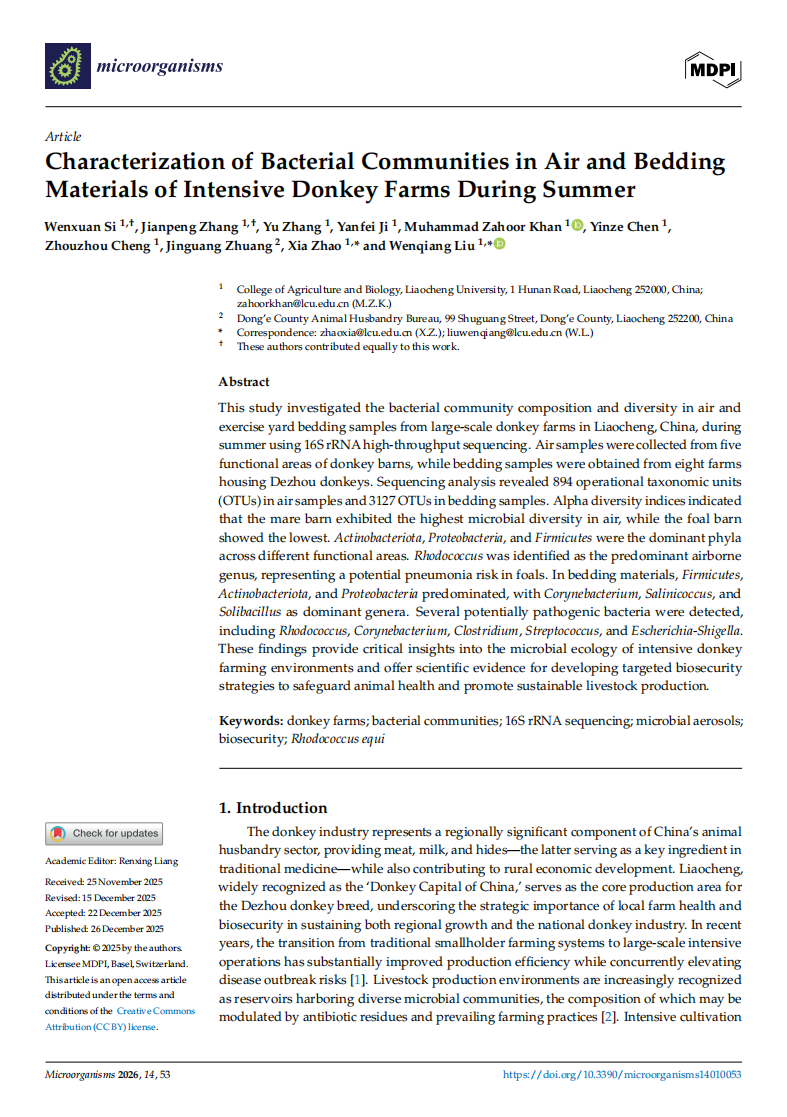 拉斯维加斯娱乐城 2024级动物学专业研究生司文轩在《microorganisms》杂志上发表了题为“Characterization of Bacterial Communities in Air and Bedding Materials of Intensive Donkey Farms During Summer”的研究论文,指导教师刘文强教授、赵霞博士。